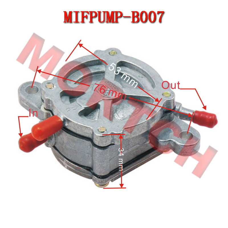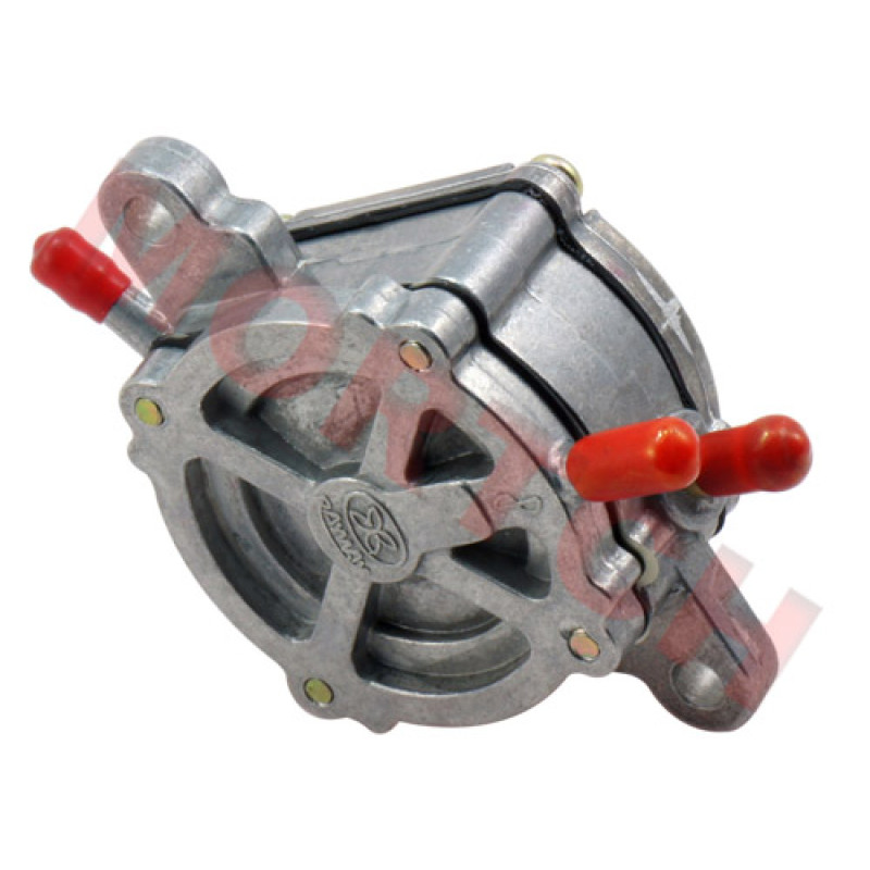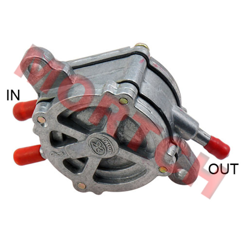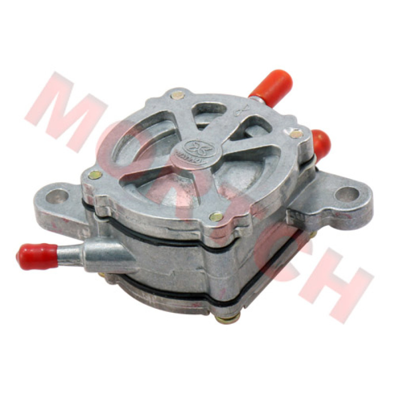 This is a low pressure mechanical pump that is mounted outside the fuel tank. Features 3 hose connectors. Usually used on scooters with the carburetor higher than the gas tank.