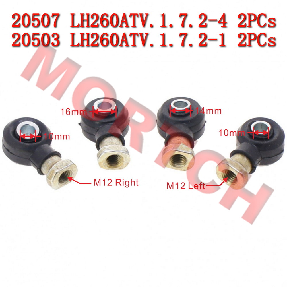 Tie Rod End A + B for the 4 stroke liquid cooled Linhai LH300 LH400 ATV. This set includes 2 pieces of left and 2 pieces of right tie rod ends. Tie rod ends are critical components of the steering system, connecting the steering linkage to the steering knuckles and transmitting steering force to the wheels for precise steering control. The 2-piece per side packaging is convenient for repairs or as spares.