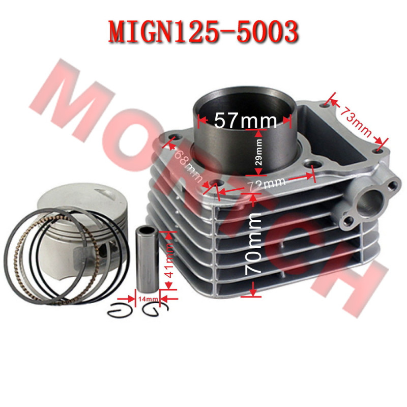Standard (57mm) Barrel Kit, 157FMI, fits Engines of Chinese made SIZUKI EN125, GN125, GS125, etc. This kit comes complete with piston, rings, pin & circlips.